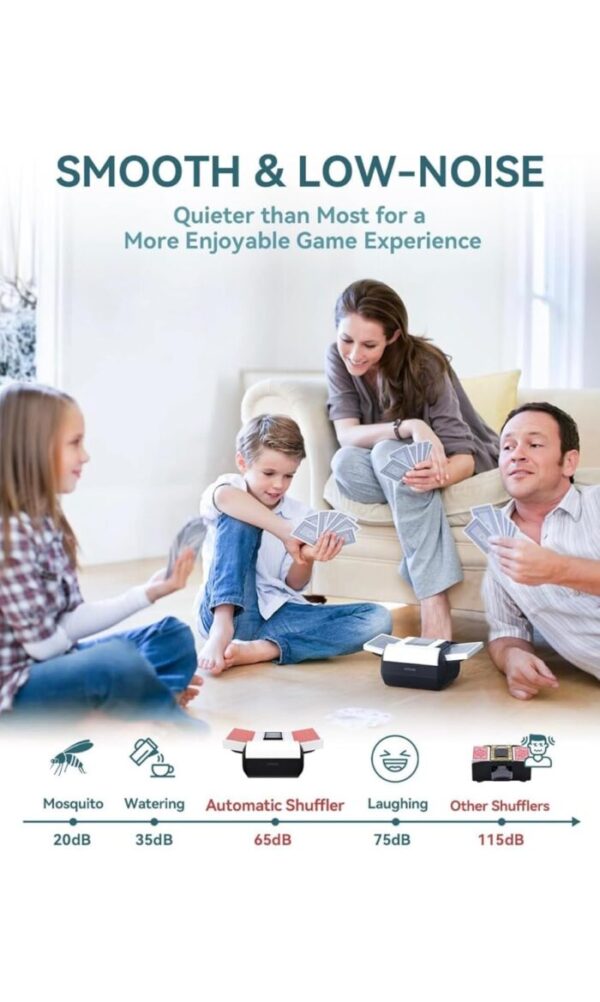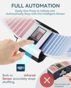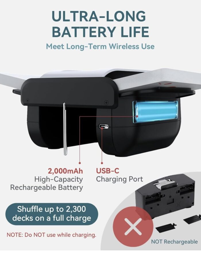 One-press automatic card shuffler with smart sensing for hands-free, accurate shuffling. Supports 1–2 decks and multiple card sizes, runs quietly, and features a rechargeable USB-C battery in a compact, portable design—ideal for poker, blackjack, UNO, and more.