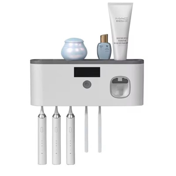 - Holds 5 Toothbrushes + Toothpaste Dispenser Designed to neatly store up to 5 toothbrushes, includes a toothpaste dispenser and toothbrush cover box to prevent dust and contamination.