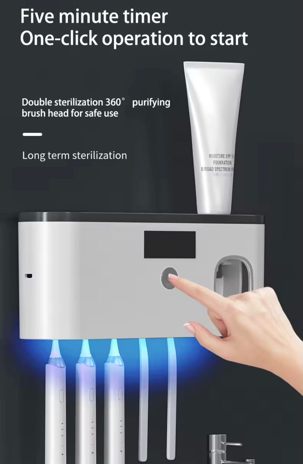 - UV Disinfection Sterilizer for Complete Hygiene Advanced UV sterilization technology helps eliminate bacteria from toothbrushes, keeping your family’s oral care safe and hygienic every day.