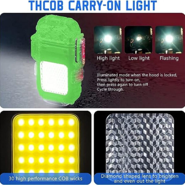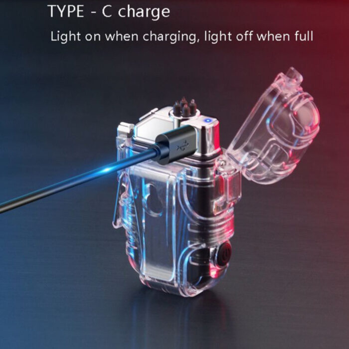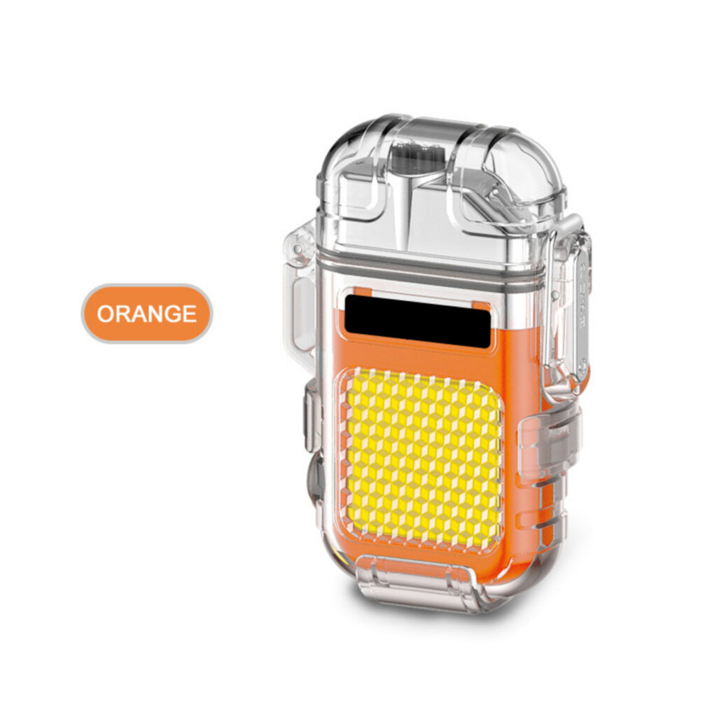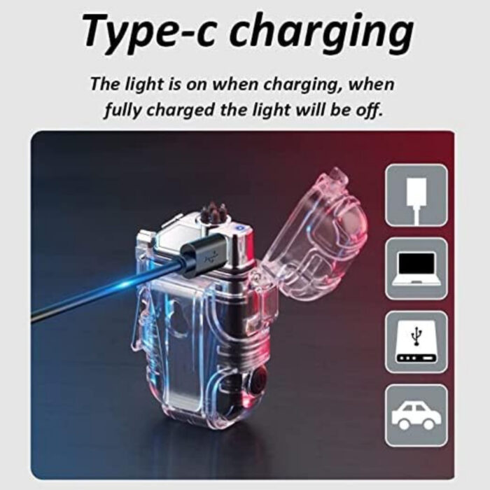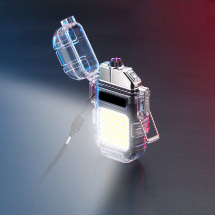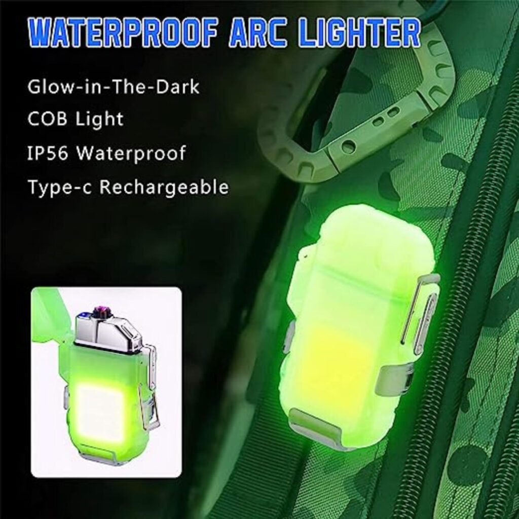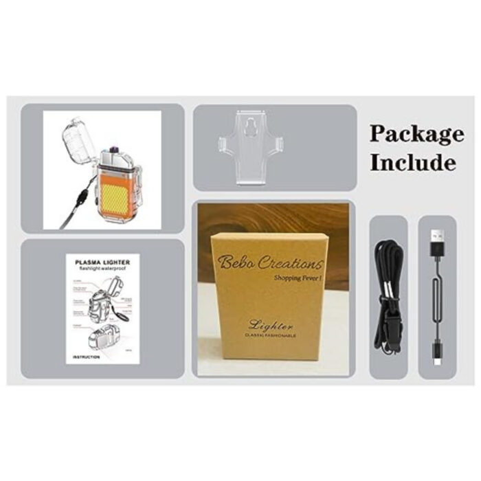 BEBO CREATIONS waterproof dual arc plasma lighter with built-in LED light and 3 lighting modes, designed for outdoor and camping use. Windproof, rechargeable via Type-C, and compact, it includes a hook, hanging string, charging cable, user manual, and premium gift box. Durable, stylish, and reliable in all weather conditions.